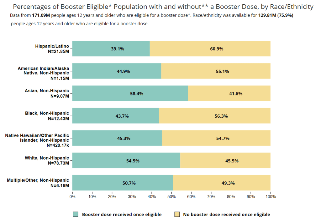 - People of color who remain unvaccinated or unboosted: Zhang’s article inspired me to also look at recent vaccination trends by race and ethnicity. Black, Hispanic, and Native Americans have been at higher risk for COVID-19 throughout the pandemic, as their minority identities often coincide with lower socioeconomic status. According to CDC data, booster shot trends are similar to the vaccination trends we saw in early 2021: while 55% of eligible white Americans have received their booster shots, that number is below 50% for Black, Hispanic, and Native Americans. It’s lowest for Hispanic or Latino Americans: only 39% of those eligible have received a booster shot, as of February 19.