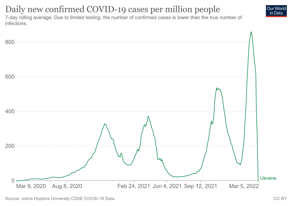 - While data on Ukraine’s cases show a decrease in recent weeks, these numbers are pretty unreliable. Our World in Data reports a steep decline from 860 new cases per million on February 12 to zero new cases in the last couple of days. This is unsurprising for a country with pressing issues to deal with than data reporting. “These numbers are going to have to be taken with some sort of salt, understanding it may be underreported, or in many ways not reported at all,” public health expert Sonny Patel told NBC.