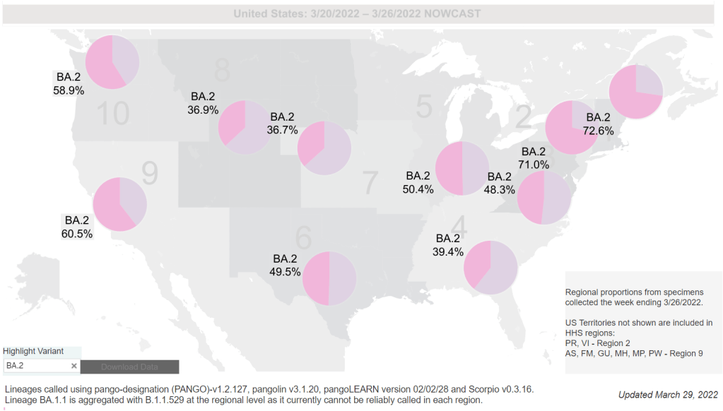 - 100% of new cases are Omicron-caused; 55% BA.2-caused (as of March 26)