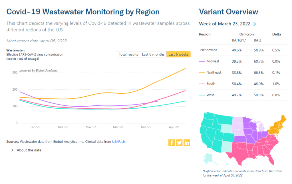 Wastewater, a leading indicator, is showing pronounced increases both nationally and in all four major regions of the country, according to Biobot’s tracker. Similarly, more than half of the wastewater monitoring sites in the CDC’s network have shown increases in coronavirus levels over the last two weeks.