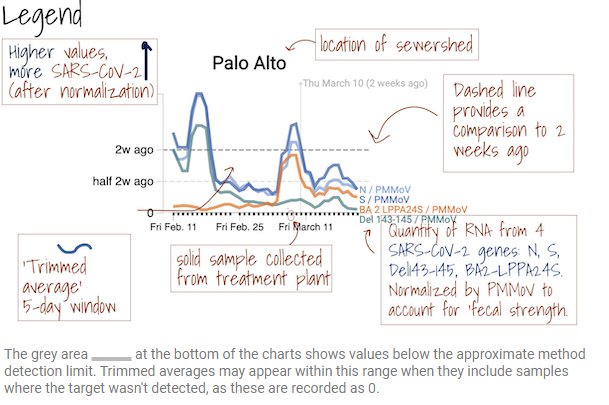 In addition to the COVID-19 charts, the SCAN website also includes data on flu and RSV levels at sewershed sites, along with a detailed methodology section. I found this document describing different sources of variability in wastewater data particularly helpful, and linked out to it in my story.