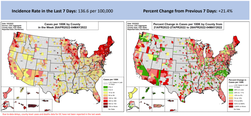 - 98% of new cases are Omicron BA.2-caused; 37% BA.2.12.1-caused (as of April 30)