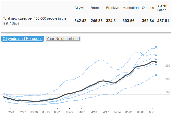One thing I’ve been wondering, in recent weeks, is when we might see cases peak in the Northeast. In New York City, where I live, case trends seemed to turn downward in mid-April; but then after about a week, the numbers went up again — perhaps a consequence of BA.2.12.1 taking over from BA.2.