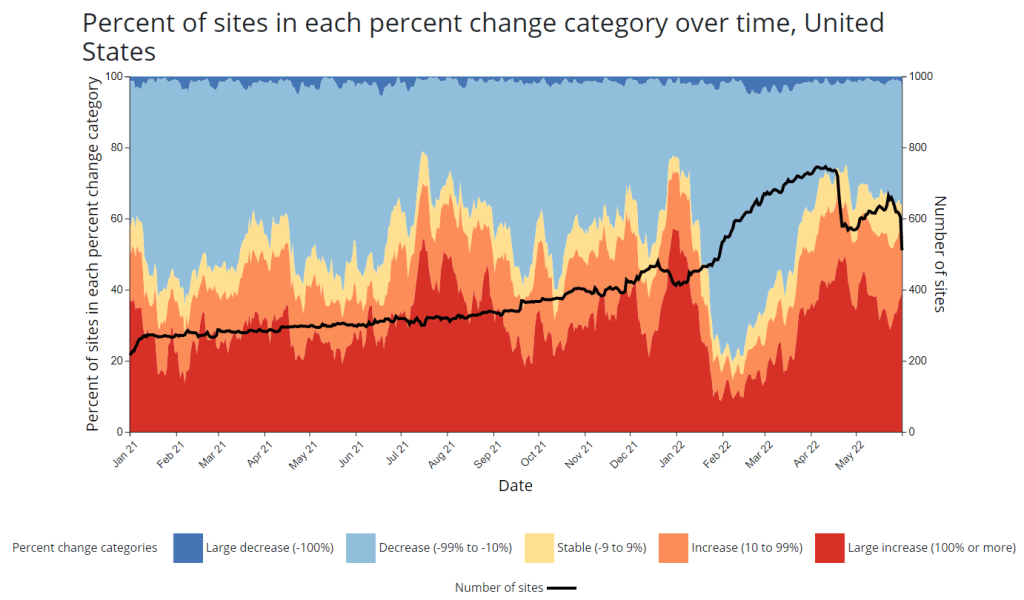 - CDC adds new chart to wastewater dashboard: This week, the CDC updated its National Wastewater Surveillance System (NWSS) dashboard with a new chart that aims to summarize the overall picture of coronavirus trends in the country’s sewers. The chart shows the percentage of NWSS sites that have reported their coronavirus concentrations decreasing, staying stable, and increasing over two-week periods; it also shows the overall number of sites with recent data. (This number dropped when NWSS switched contractors, though it has ticked back up in recent weeks as Biobot onboards sites.) Of course, the sites included in NWSS represent a small fraction of the U.S. population, and different locations are using different analysis methods which may be difficult to summarize. But the new chart is still a helpful way to see national trends from the surveillance network.