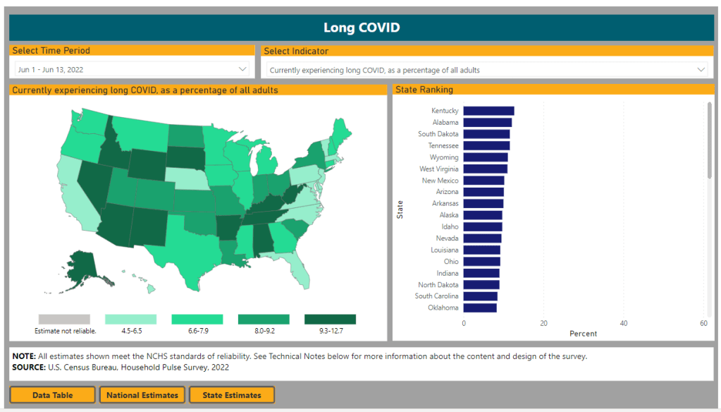 In the most recent iteration of this survey, which started on June 1, the Census is asking respondents about Long COVID: specifically, respondents can share whether they had COVID-related symptoms that lasted three months or longer. The first round of data from this updated survey were released last week (representing respondents surveyed between June 1 and June 13), in a collaboration between the Census and the CDC’s National Center for Health Statistics (NCHS).