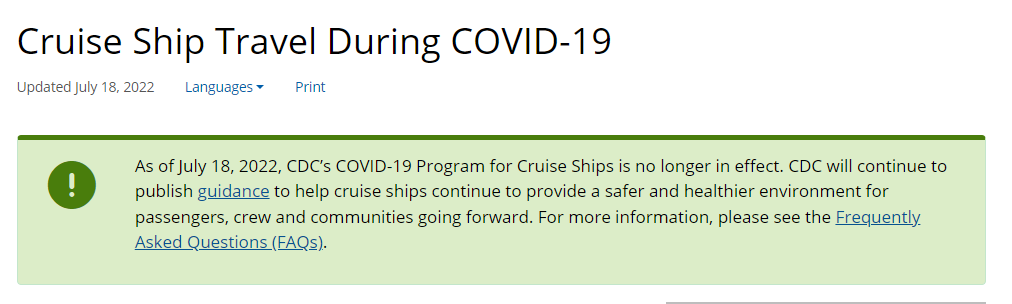 As of July 18, 2022, CDC’s COVID-19 Program for Cruise Ships is no longer in effect. CDC will continue to publish guidance to help cruise ships continue to provide a safer and healthier environment for passengers, crew and communities going forward.