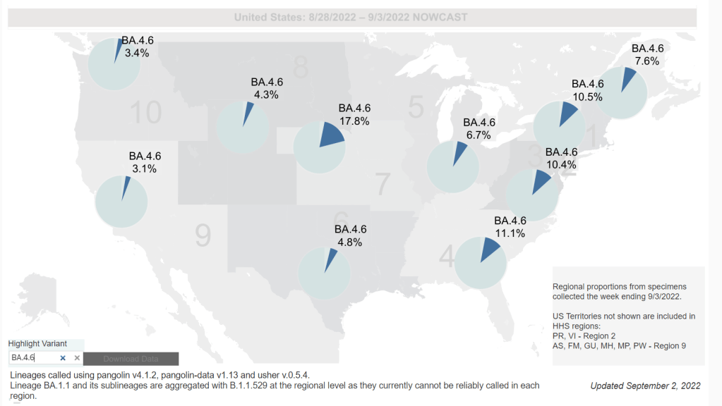 - Slow rise of BA.4.6 is worth watching: As I mentioned in today’s National Numbers post, a newer subvariant labeled BA.4.6 is gaining ground over other versions of Omicron in the U.S. BA.4.6 evolved from BA.4, and has an additional mutation in the virus’ spike protein that enables it to bypass protection from prior infections. It’s unclear whether BA.4.6 will be able to fully outcompete BA.5, which is currently causing the vast majority of U.S. COVID-19 cases—these two strains are similar enough that the competition may go slowly. So far, the subvariant has been more prevalent in the Midwest than other regions of the country, according to CDC data. Also worth watching: BA.2.75, a subvariant that is dominating some European countries but hasn’t shown up significantly in the U.S. yet.