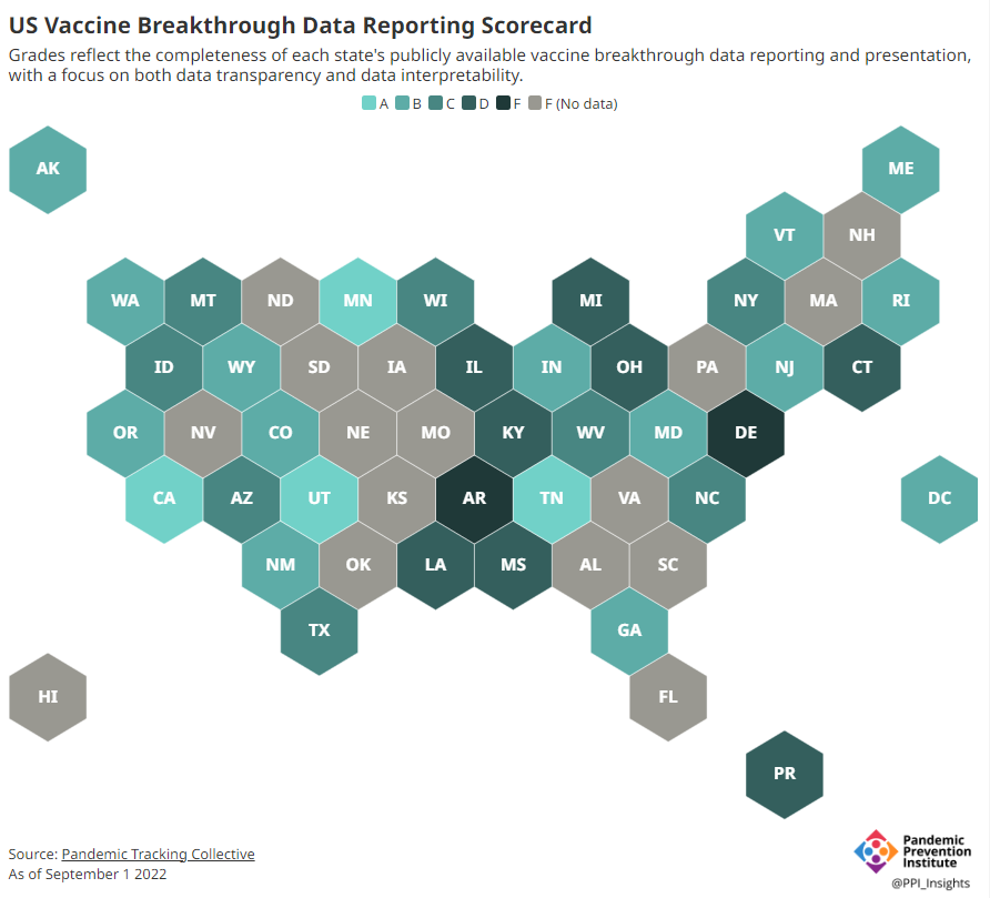 Consider breakthrough cases as one example. According to the Pandemic Prevention Institute’s scorecard for breakthrough data reporting, about half of U.S. states have D or F grades, meaning that they are reporting zero or very limited data on post-vaccination COVID-19 cases. The number of states with failing grades has increased in recent months, as states reduce their COVID-19 data resources. As a result, federal agencies have an incomplete picture of vaccine effectiveness.