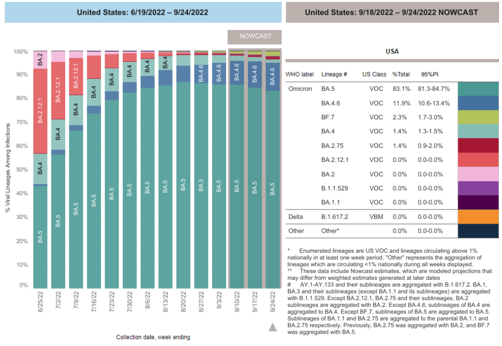 This week, BF.7 passed BA.2.75, another worrying lineage, in the CDC’s prevalence estimates: the CDC found that it caused about 2.3% of new cases nationwide in the week ending September 24. It’s most prevalent in the Northeast right now: in New England, it caused almost 4% of new cases last week, the CDC estimates.