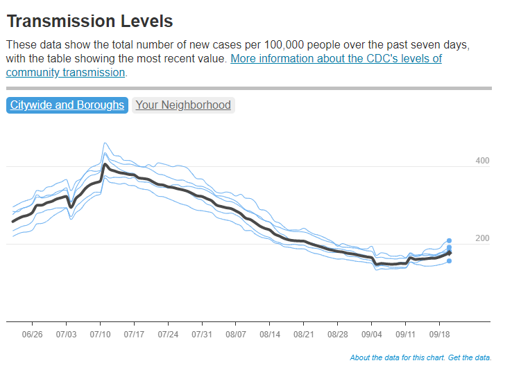 According to the latest Community Profile Report, states reporting significant increases in cases from week to week include Nevada, California, New Hampshire, Kentucky, Massachusetts, New Jersey, New York, and Oregon. In New York City—often a bellwether for new surges—cases have started to tick up slightly, according to the city’s health department, after a long (and slow) decline from July’s summer peak.