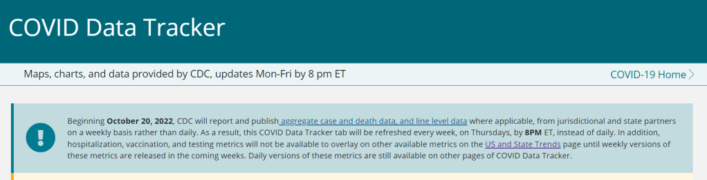 To me, the CDC’s shift to weekly updates feels like the end of an era for tracking COVID-19. While I understand the change, considering both our less-complete case information and other data analysis needs for the agency, I can’t help but wish we had a national public health agency with enough resources to continue providing us with frequent, reliable information on this ongoing pandemic. After all, shouldn’t that be the CDC’s job?