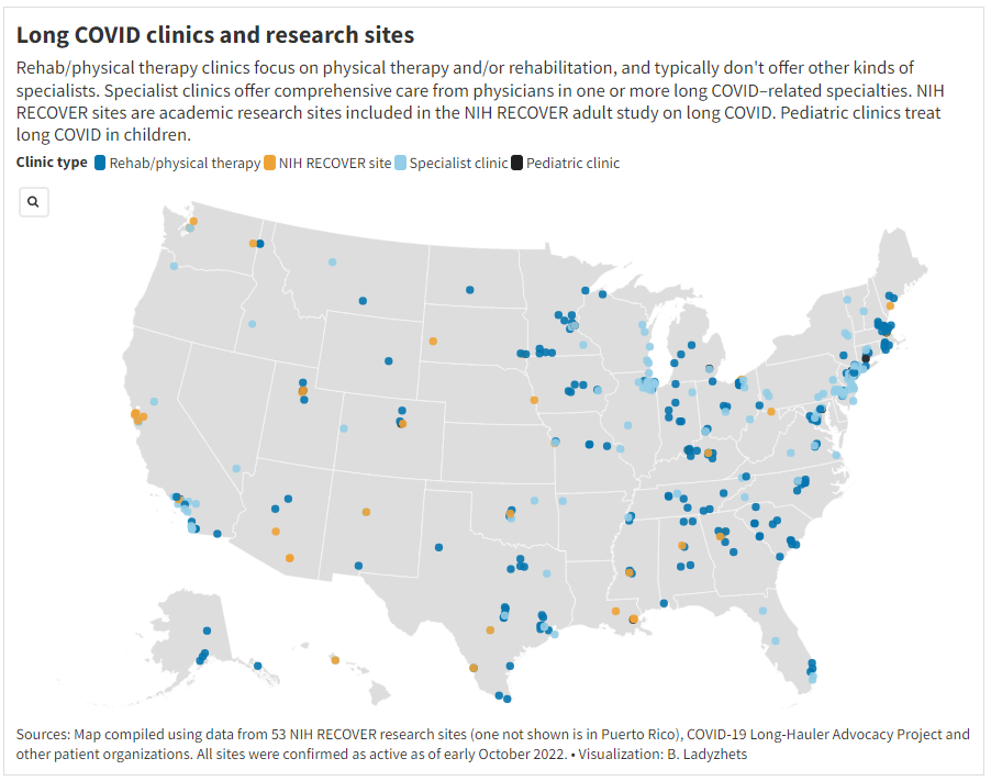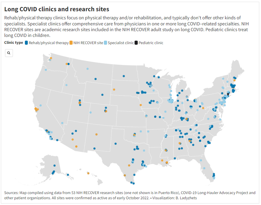 One topic that I’m hoping to dig into more is gaps in access to healthcare for Long COVID. A data project I did for Science News, published this week, shows that clinics dedicated to this condition are generally concentrated in big cities, particularly on the East coast. Yet many of the places with the highest Long COVID prevalence are rural areas in the South and Midwest, according to the Household Pulse survey.