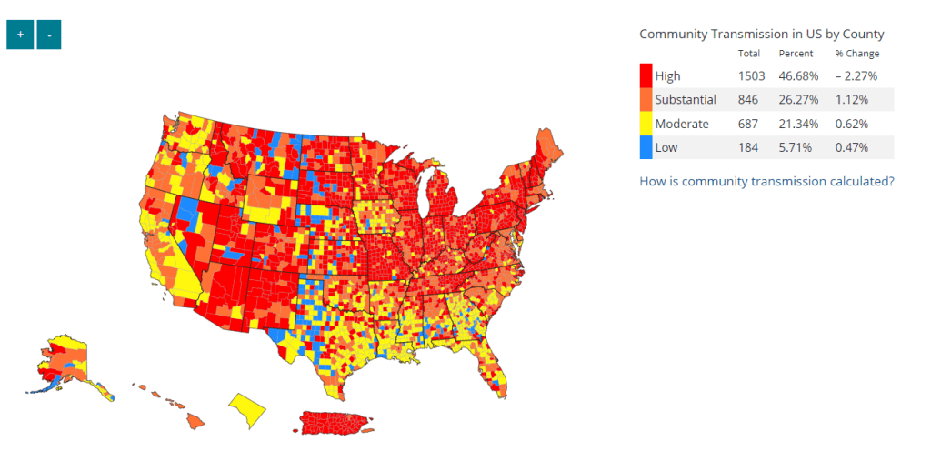 Despite the undercounting, the CDC’s Community Transmission Levels (based on case rates and test positivity) suggest that 75% of U.S. counties are experiencing “high” or “substantial” coronavirus spread. If we had more accurate data, that number would likely shoot up to 100%. In other words, even today’s seemingly-low and underestimated case numbers are still high compared to earlier periods of the pandemic.