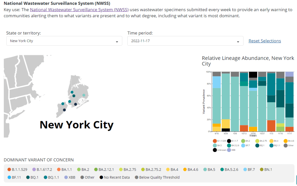 While NWSS is mostly focused on tracking coronavirus concentrations in wastewater as a proxy for transmission patterns, about 100 sites in the national network are also sequencing their wastewater samples and providing variant data. These data are available on the “Variant Summary” page of the CDC’s COVID Data Tracker, along with data from the CDC’s clinical specimen and traveler surveillance systems.