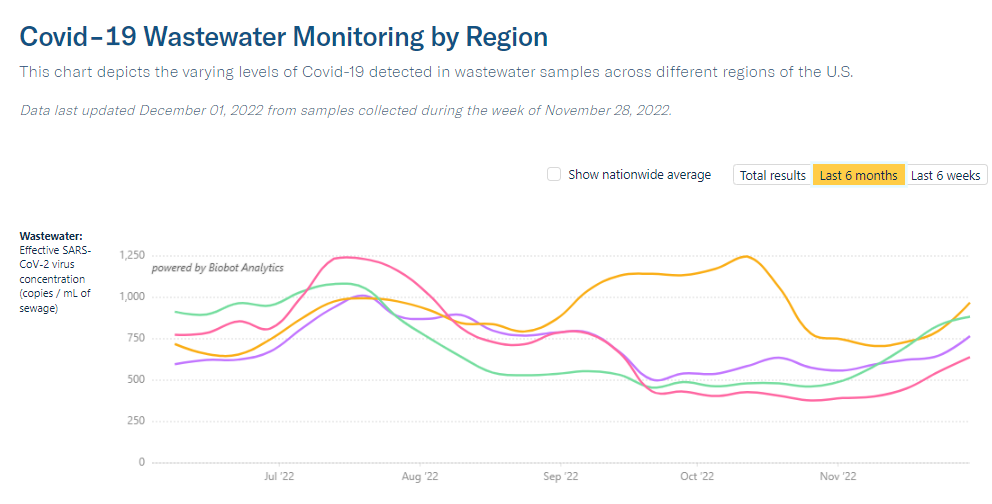 All four major regions of the country are experiencing clear upward trends in COVID-19 spread, per Biobot, with no sign of peaking; this is the first time there’s been a unified national increase since mid-summer. Individual metropolitan areas from Boston, to the Twin Cities in Minnesota, to Los Angeles, are reporting major upticks.