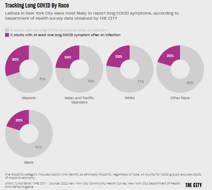 Hispanic or Latino New Yorkers were more likely to report Long COVID symptoms than other demographic groups, in a 2021 survey by the city health department. Chart via THE CITY.