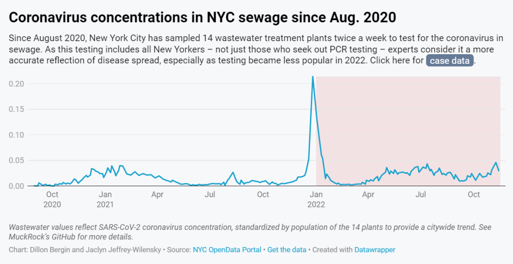 • In response to our questions, city health and environment agency officials argued that wastewater results “do not generally provide a complete picture” of how COVID-19 is spreading and said, unlike in other parts of the country, trends in city wastewater data tend to align with case counts rather than predicting them. But wastewater has shown a higher level of COVID-19 spread than PCR testing, as the latter became less available in 2022, according to Gothamist and MuckRock analyses. This pattern suggests that the sewage numbers may more accurately reflect actual disease patterns.
