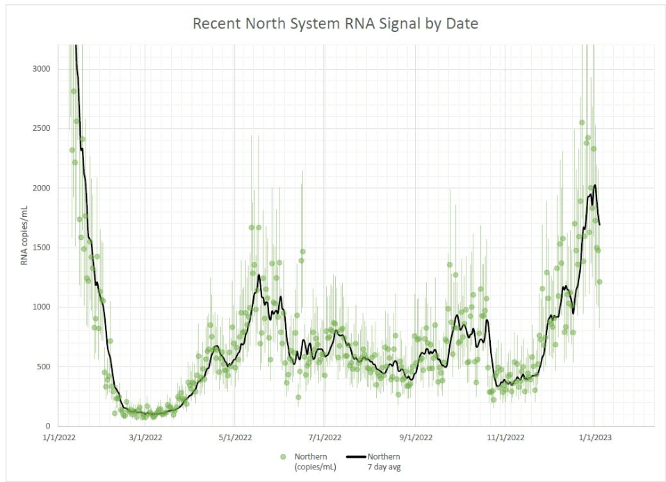Regionally, the Northeast has reported the biggest recent COVID-19 spike in wastewater, though the trend may already be turning around. We see this both in Biobot’s regional data and in individual cities and counties, like Boston and New York City. The Northeast is also a hotspot for XBB.1.5, a homegrown Omicron subvariant that’s spreading faster than other lineages. (More on that later in the issue.)