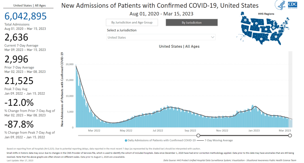 Even so, the official case data, hospital admissions, and wastewater surveillance all point to continued decreases in coronavirus transmission. National hospital admissions dropped by about 12% this week compared to the week prior. But there are still a lot of Americans getting severe COVID-19 symptoms, with more than 3,000 people newly hospitalized each week for the last month.