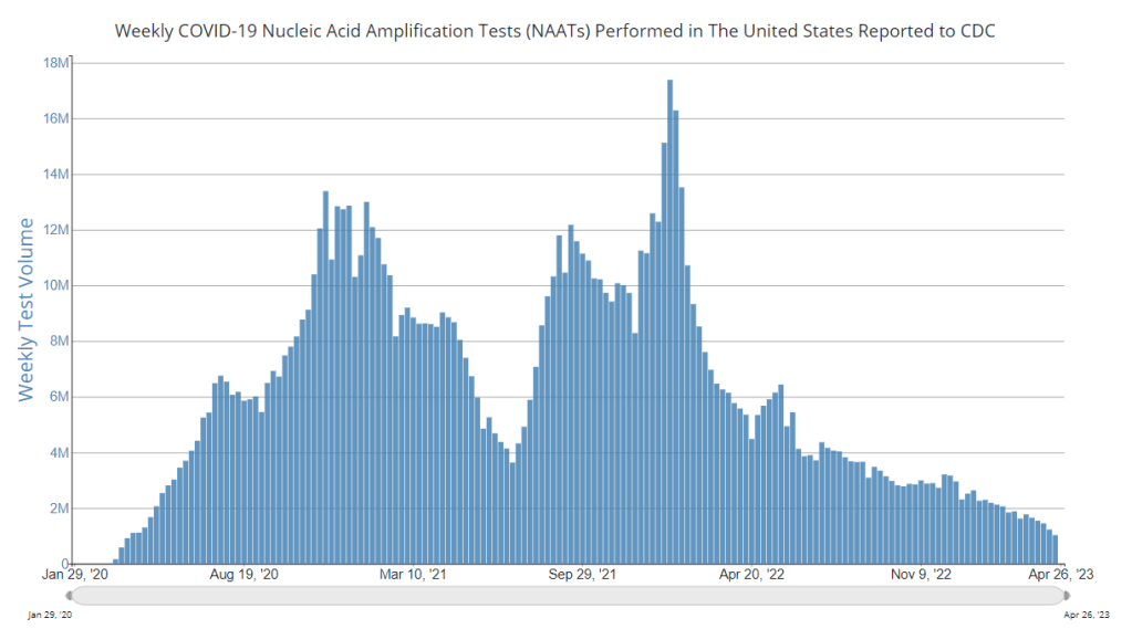 In addition to the ongoing reporting issues from state health departments, it’s important to remember that PCR testing continues to decline across the country. About one million PCR and similar lab test results were reported to the CDC last week, compared to peaks over 10 million per week during major surges.