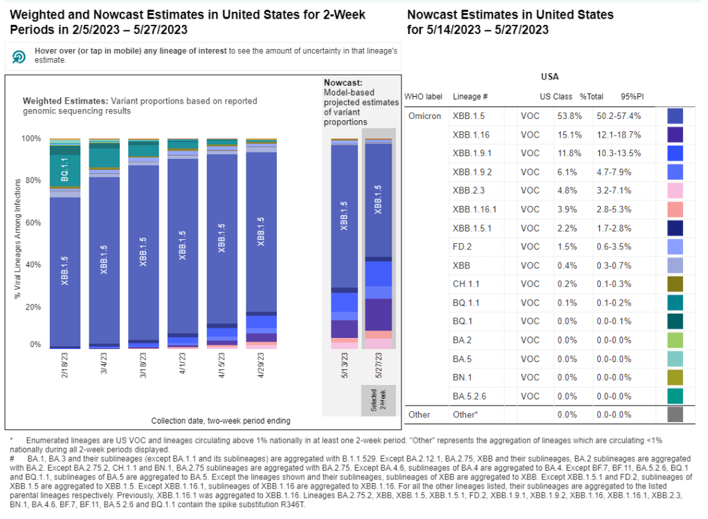 - 54% of new cases are caused by Omicron XBB.1.5; 19% by XBB.1.16; 18% by XBB.1.9 (as of May 27)