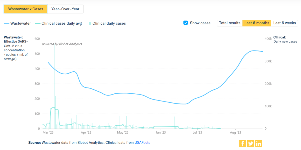 - A 1% lower concentration of SARS-CoV-2 in wastewater than last week (as of August 23, per Biobot’s dashboard)
