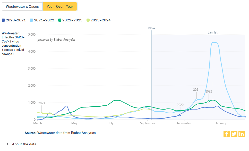Biobot’s wastewater data suggest that COVID-19 spread in the U.S. is similar now to this time in 2021, during the Delta surge. If 2023 continues to follow trends from the last two years, we could see transmission plateau in early fall, then rise again during the holiday season.  Any lull that we do experience may be a good time to stock up on masks, rapid tests, and other tools to protect yourself and your community.