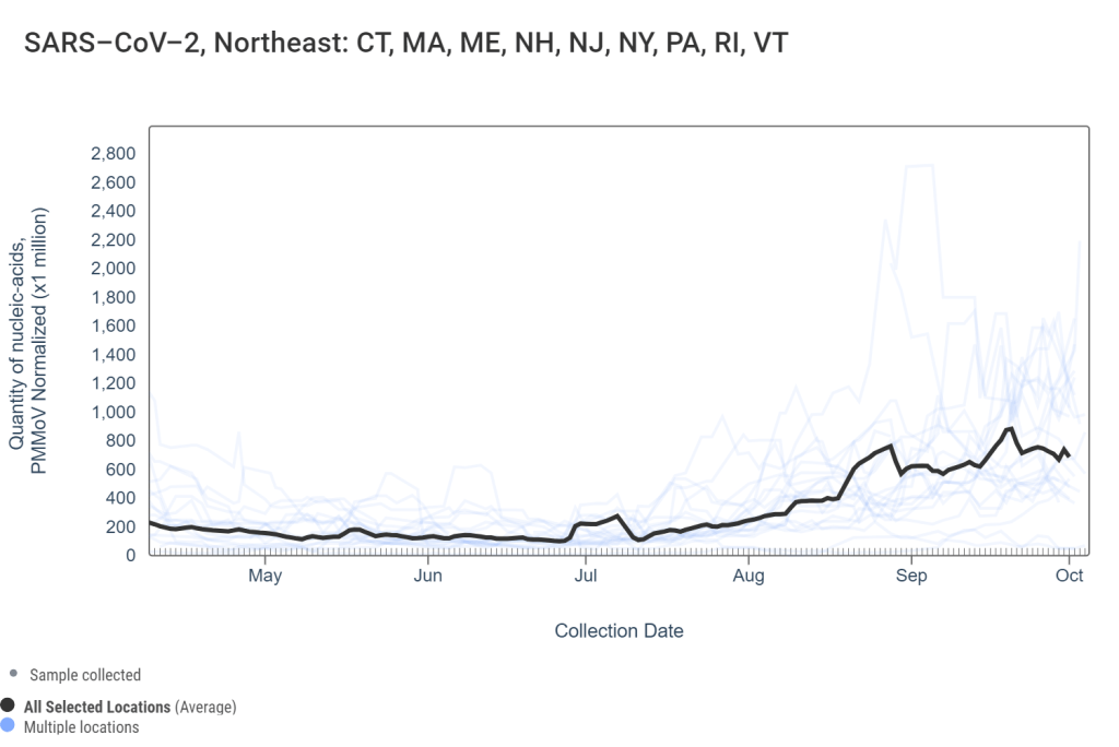 Some Northeast cities are reporting significant upticks in the last week, including South Boston, Portland, Maine, and Montpelier, Vermont (the latter two report to WastewaterSCAN). In past years, late fall/winter surges have started in the Northeast and Midwest, as these regions see colder weather earlier, sometimes paired with the introduction of new variants. It seems likely that a similar trend will occur this year.