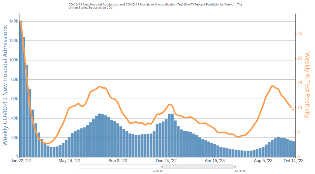 - A 14% lower concentration of SARS-CoV-2 in wastewater than the prior week (as of October 11, per Biobot’s dashboard)