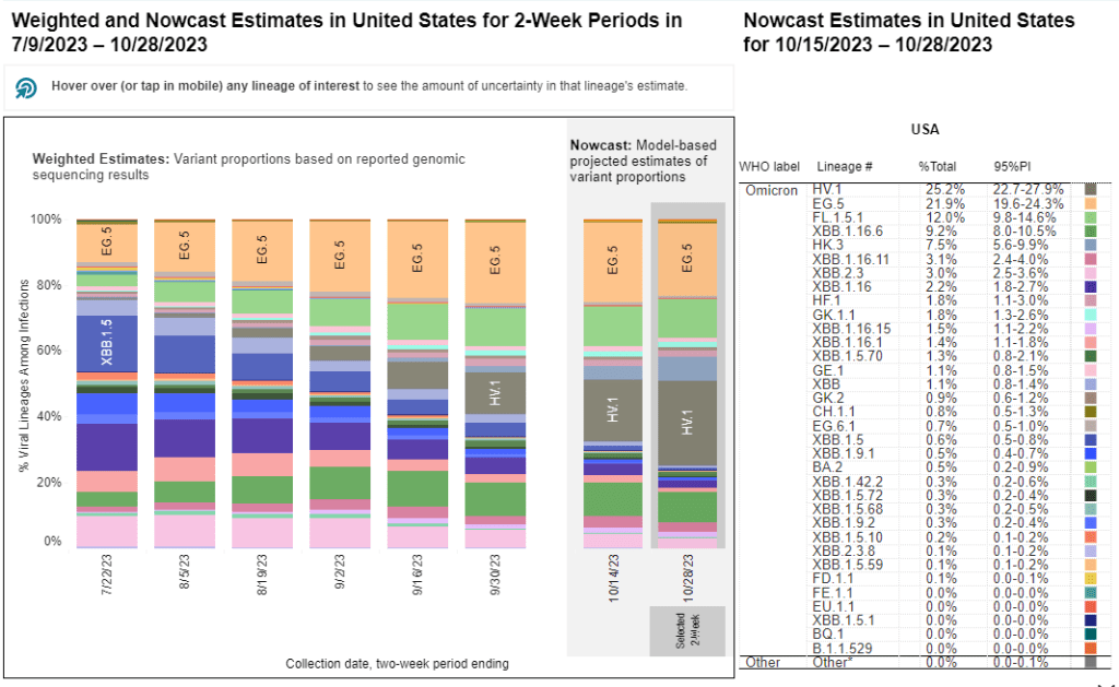 The CDC’s variant surveillance estimates suggest that EG.5 and FL.5.1 have been prominent—but not really dominant—variants in the U.S. this fall. In the CDC’s most recent update, the agency estimates that these variants caused 22% and 12% of cases respectively during the two weeks ending October 28. They don’t appear different enough from other XBB.1.5 relatives to really break through and cause a surge.