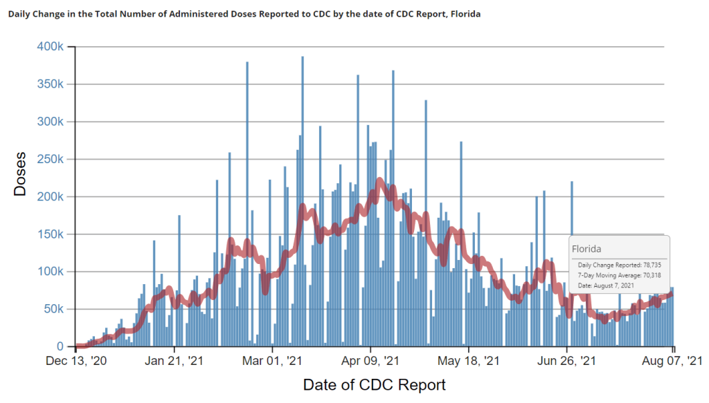 Florida and Louisiana continue to be major COVID-19 hotspots, but Mississippi is now seeing the country’s highest case numbers—753 cases per 100,000 residents in the past week, per Friday’s Community Profile Report. Kentucky, South Carolina, Georgia, Alabama, and Arkansas all recorded over 500 cases per 100,000 last week as well. Hurricane Ida, now on track to hit New Orleans, is sure to complicate COVID-19 prevention efforts in Louisiana and other coastal states.