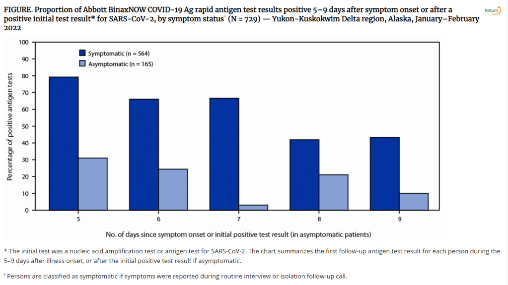 Later in February, a study in the CDC’s Morbidity and Mortality Weekly Report (MMWR)—or, the CDC’s own journal—shared similar results. The report, authored by CDC researchers and practitioners at a healthcare system in rural Alaska, looked at antigen test results from hundreds of infections reported to this health system during the Omicron wave.