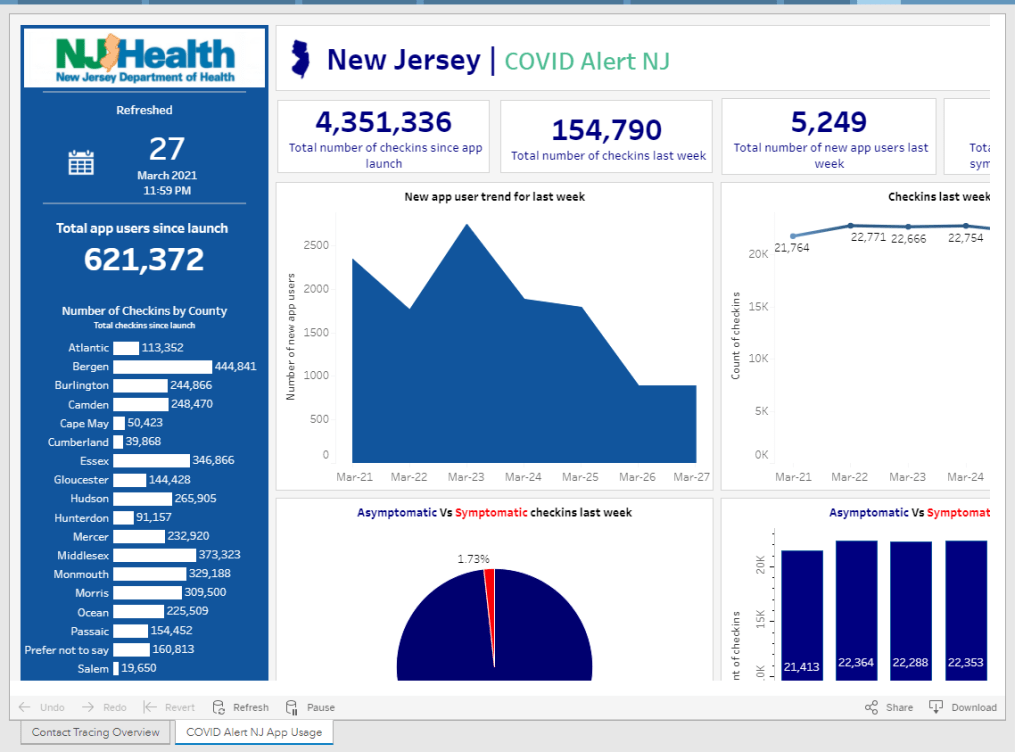 BW: Wow! Is that data publicly available, on say, how many people in a certain country have downloaded apps? I know, one state that I’ve found is publishing their data is New Jersey, they have a contact tracing pane on their dashboard. I was curious if you’d seen that, if you have any thoughts on it, or if there are any other states or countries that are doing something similar.