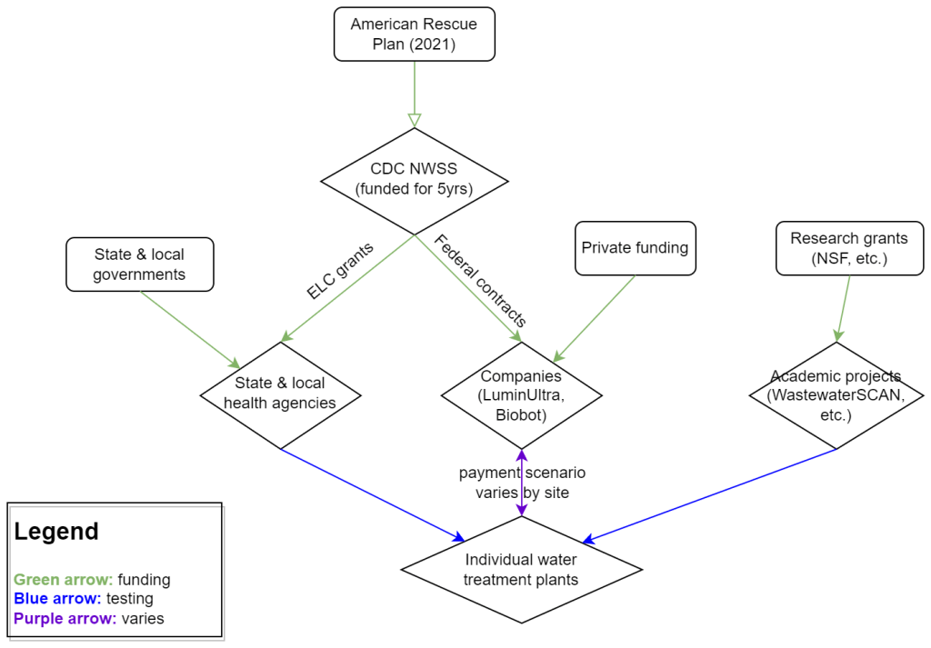 My attempt to explain the wastewater surveillance funding ecosystem in one diagram. (Credit: Betsy Ladyzhets)
