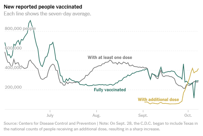 Booster shots continue to inflate vaccination numbers, as these third doses comprise between one-third and one-half of doses administered in the U.S. each day. Over 11 million people have already received a booster dose—more than the total doses administered in a number of low-income countries.